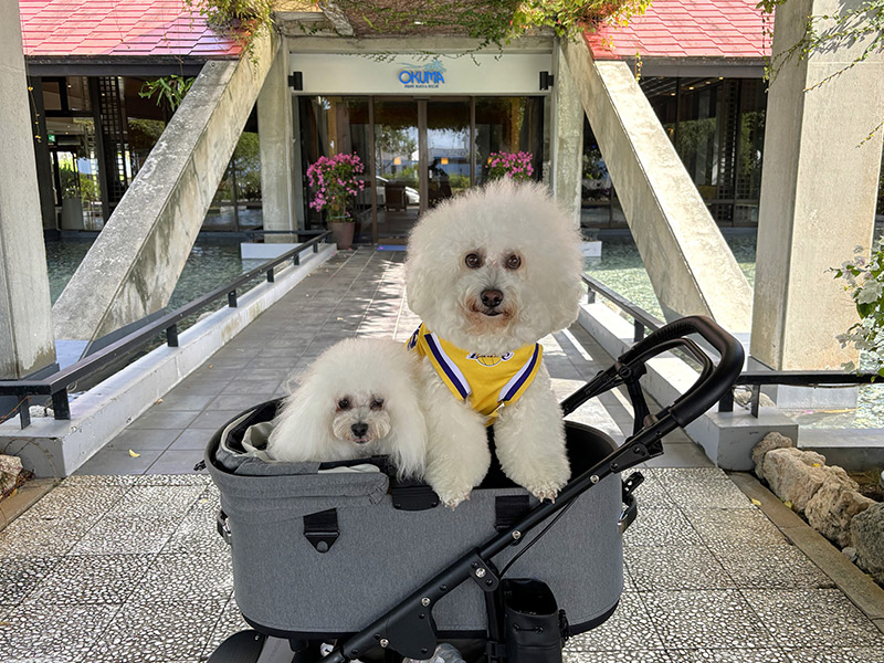お姫様なマーリィちゃんと、ウーマクー(沖縄方言でわんぱく)のボブちゃん。ホテルでの散歩がとにかく楽しい様子で、ビーチでもたくさん泳ぎました。
